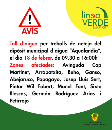 Per treballs de neteja en el dipòsit municipal d'aigua "Aqualandia" hi haurà una suspensió programada del servei el 18 de febrer, de 09:30 a 16:00 hores.